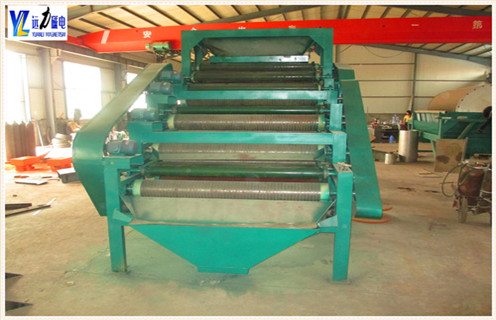 1、強磁輥式磁選機采用Q235或DT4材料制成的芯軸管,所述芯軸管上套裝有磁環(huán)、鐵環(huán),所述磁環(huán)由釹鐵硼材料制成,所述鐵環(huán)由Q235材料制成,所述芯軸管兩端分別螺裝有將芯軸管兩端封閉的軸頭,所述軸頭由不銹鋼材料制成,所述軸頭上螺裝有用于將磁環(huán)和鐵環(huán)壓緊的螺母;所述磁環(huán)包括正極磁環(huán)和負極磁環(huán),相鄰兩個鐵環(huán)之間設(shè)有兩個極性相反的磁環(huán),且每個鐵環(huán)兩側(cè)的磁環(huán)的極性相同。